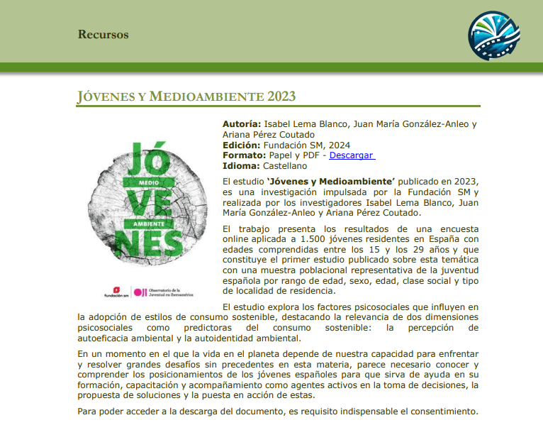 González-Anleo, J.M., Lema-Blanco, I. & Pérez Coutado, A. (2023). Jóvenes y Medio Ambiente. Fundación SM, Ediciones SM. ISBN: 978-84-118-2187-2.